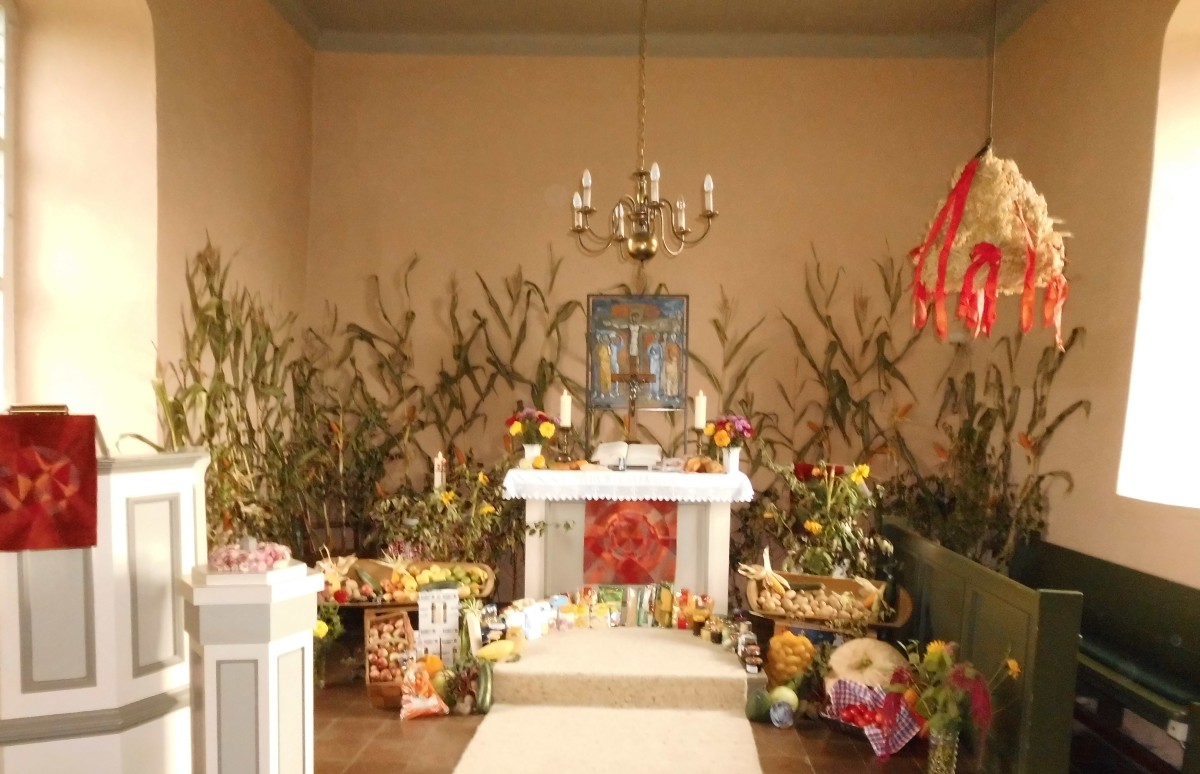 Lütgenrode/Gladebeck; Auf Initiative der Arbeitsgemeinschaft (AG) zur Erhaltung der historischen St. Johannis Kapelle Lütgenrode hat die Kirchengemeinde Parensen-Lütgenrode eine Sammlung zum diesjährigen Erntedankgottesdienst in Lütgenrode durchgeführt. So wurden u.a. fast 15 kg Mehl, 10 kg Zucker und rund 20 Pfund Äpfel, Birnen und Kartoffeln aus den heimischen Gärten sowie eine größere Menge Nudeln gespendet und diese schmückten im Gottesdienst den Altarbereich.