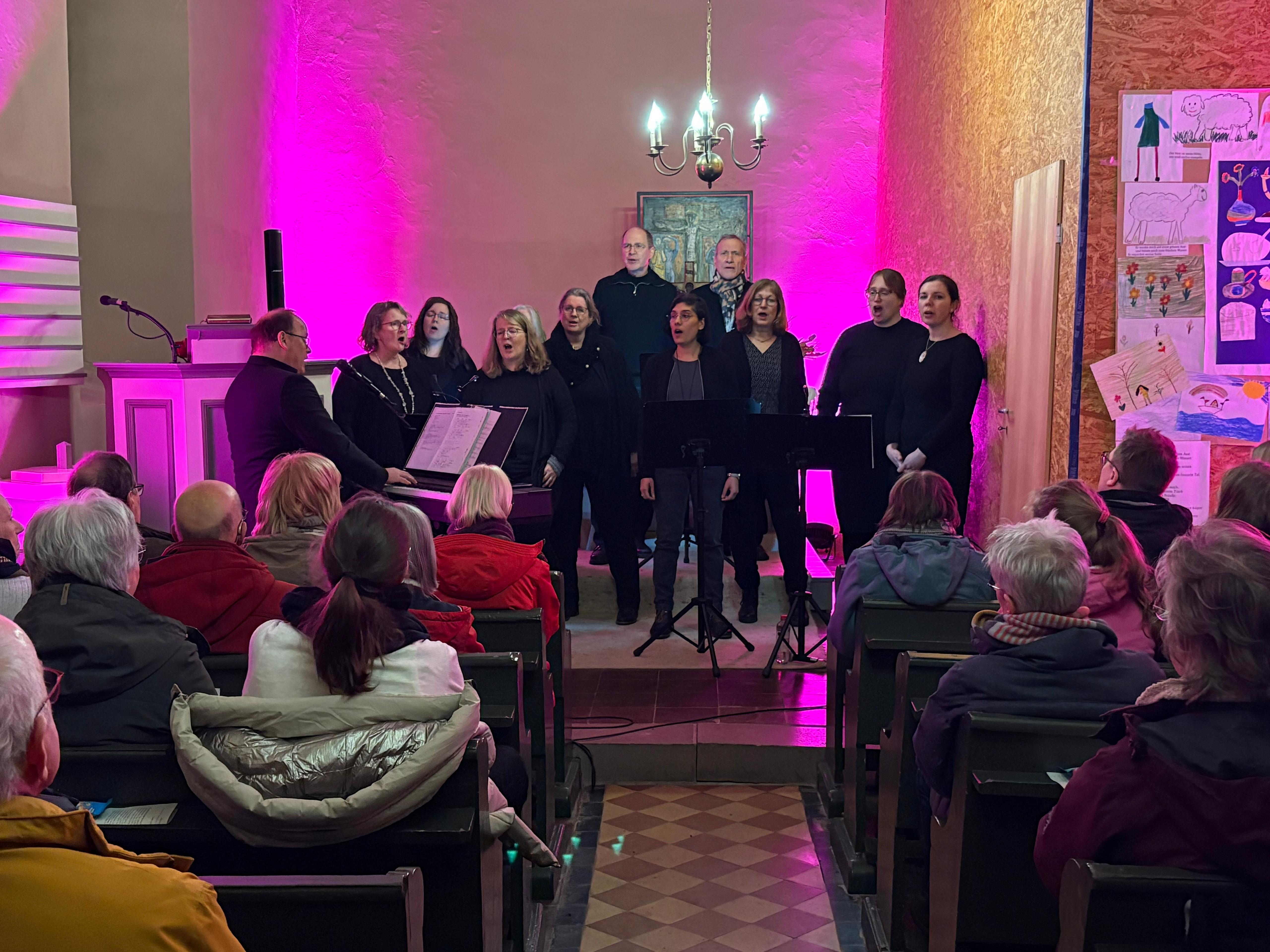 Lütgenrode; Die Kapelle Lütgenrode erstrahlte in einem Violet und der Besucherstrom riss nicht ab. Am ersten Freitag im Februar konnte die Arbeitsgemeinschaft den Gospelchor des Kirchenkreises Göttingen-Münden „Leon on me“ unter Leitung des Pop-Kantors Rüdiger Brunkhorst begrüßen. Das Ensemble war mit 11 Sängern angereist und füllte damit nicht nur den kleinen Altarraum der Kapelle aus, sondern erfüllte auch den ganzen Raum mit seinen professionellen Stimmen.
