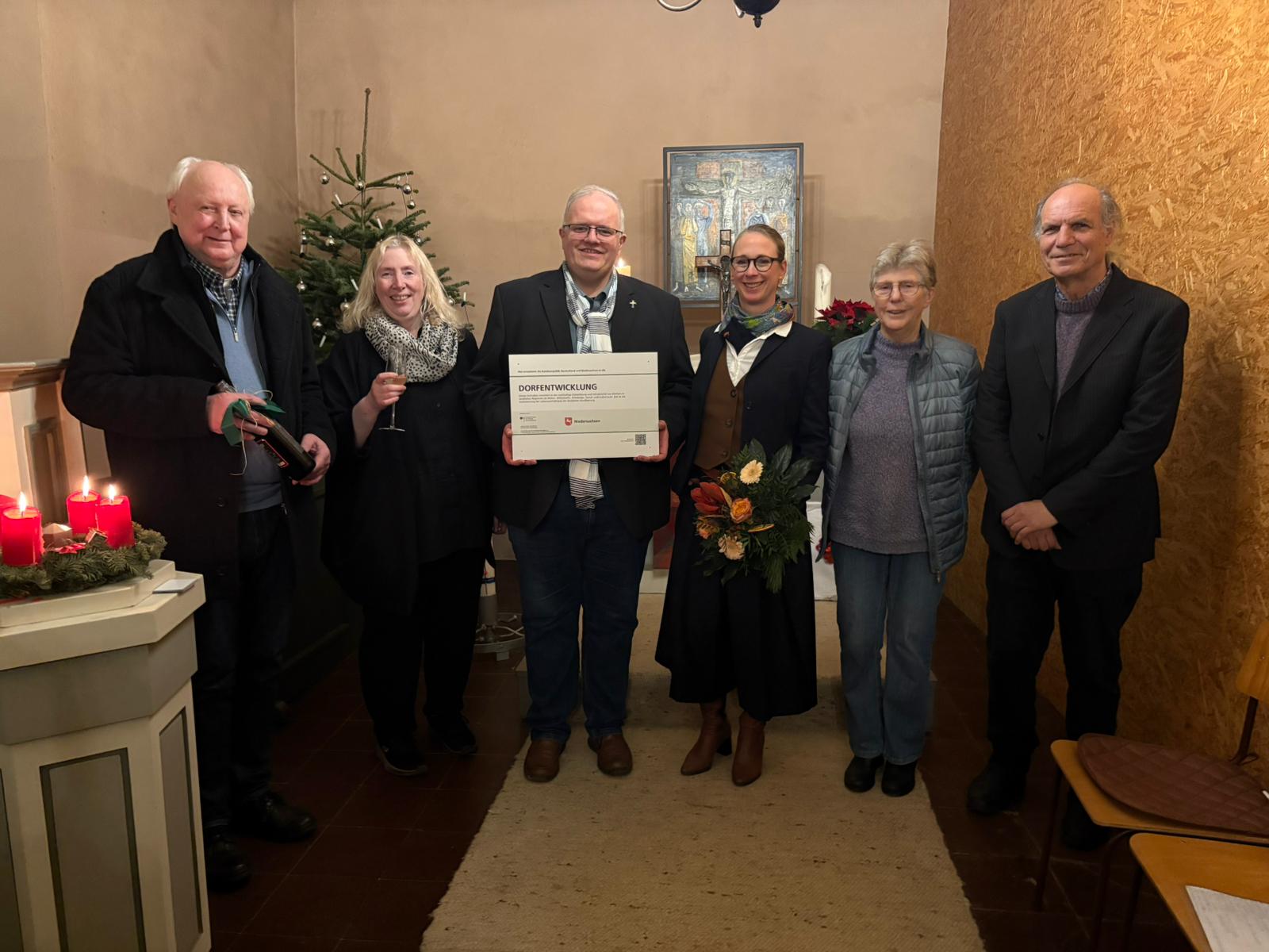 Die Pause des Abends nutzten die Superintendentin des Kirchenkreises Göttingen-Münden Marit Günther-Menzel und der Vorsitzende des Kirchenvorstandes der Kirchengemeinde Nörten-Parensen-Lütgenrode- Bishausen Prof. Dr. Herbert Asselmeyer den Anwesenden noch eine Freude vor den Festtagen zu übermitteln. So konnten Beide mitteilen, dass der Kirchengemeinde auf ihren Antrag hin rund 150.000 € aus dem Dorferneuerungsprogramm „Leineweber-Sechseck“ bewilligt wurden. Dazu gab es auch ein entsprechendes Schild, was an den Vorstand der Arbeitsgemeinschaft stellvertretend von der Superintendentin übergeben wurde.