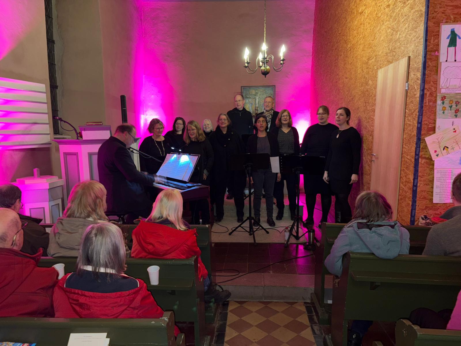 Lütgenrode; Die Kapelle Lütgenrode erstrahlte in einem Violet und der Besucherstrom riss nicht ab. Am ersten Freitag im Februar konnte die Arbeitsgemeinschaft den Gospelchor des Kirchenkreises Göttingen-Münden „Leon on me“ unter Leitung des Pop-Kantors Rüdiger Brunkhorst begrüßen. Das Ensemble war mit 11 Sängern angereist und füllte damit nicht nur den kleinen Altarraum der Kapelle aus, sondern erfüllte auch den ganzen Raum mit seinen professionellen Stimmen.
